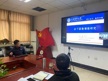 其次,张卫东博士做了以“水下图像增强研究”为主题的学术交流分享,具体介绍了水下图像的分类、增强方法及图像去雾,遥感云检测,高分辨重建和医学图像处理等内容。通过此次学术交流,促进了教师们对人工智能在相关领域应用的了解。