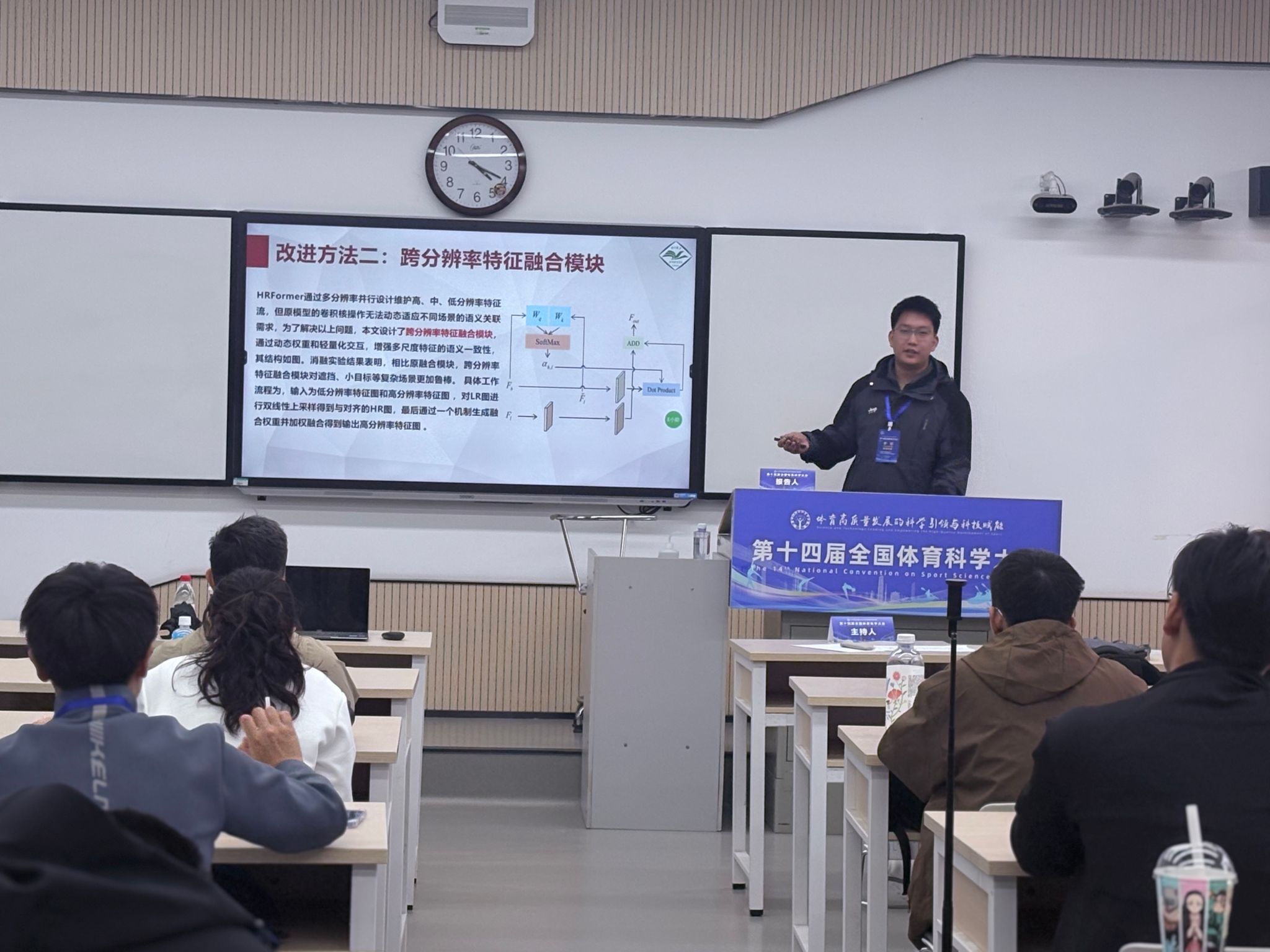 11月7日至9日,由中国体育科学学会主办,武汉体育学院、华中师范大学承办的“第十四届全国体育科学大会”在武汉隆重举行。91官网 计科232班王一兆同学的论文《HRFormer++:一种融合动态窗口与跨分辨率机制的遮挡鲁棒型运动姿态估计建模网络》受邀在人工智能体育与体育工程统计分会作专题报告,其另一篇论文《新质化升级背景下基于短跑运动员多模态数据的潜力预测深度学习模型构建》被作为海报宣传。