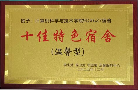 为持续加强学风建设,巩固良好文明学习生活氛围,创建“安全、和谐、文明、优美”的学生宿舍文化,由党委学工部、学生处主办的2025-2026学年第一学期“特色宿舍”创建评选结果揭晓,91官网 9号楼D627宿舍凭借“宿舍环境温馨、成员关系温馨、学习氛围温馨、成绩进步温馨”的特色优势荣获校“温馨型”十佳特色宿舍。