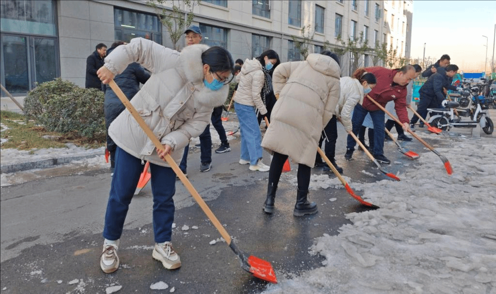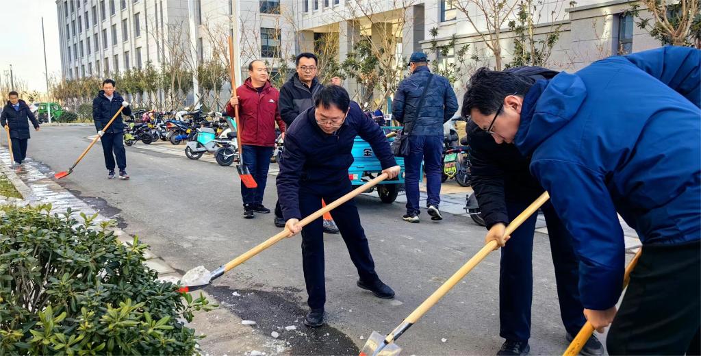 在除冰现场,党员志愿者不畏严寒,干劲十足,挥舞着铁锹,默契配合,一派热火朝天的景象,一个多小时就将原本被坚冰覆盖的道路清除干净,为师生开辟了一条洋溢着暖暖温情的安全之路。