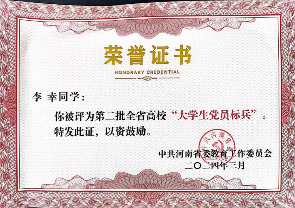 本次评选根据《关于开展第二批全省高校“大学生党员标兵”选树活动的通知》(豫教工委办〔2023〕38号)要求,在各高校遴选、推荐的基础上,省委教育工委组织专家,对各高校党委推荐的“大学生党员标兵”人选进行了评审,李幸同学脱颖而出。