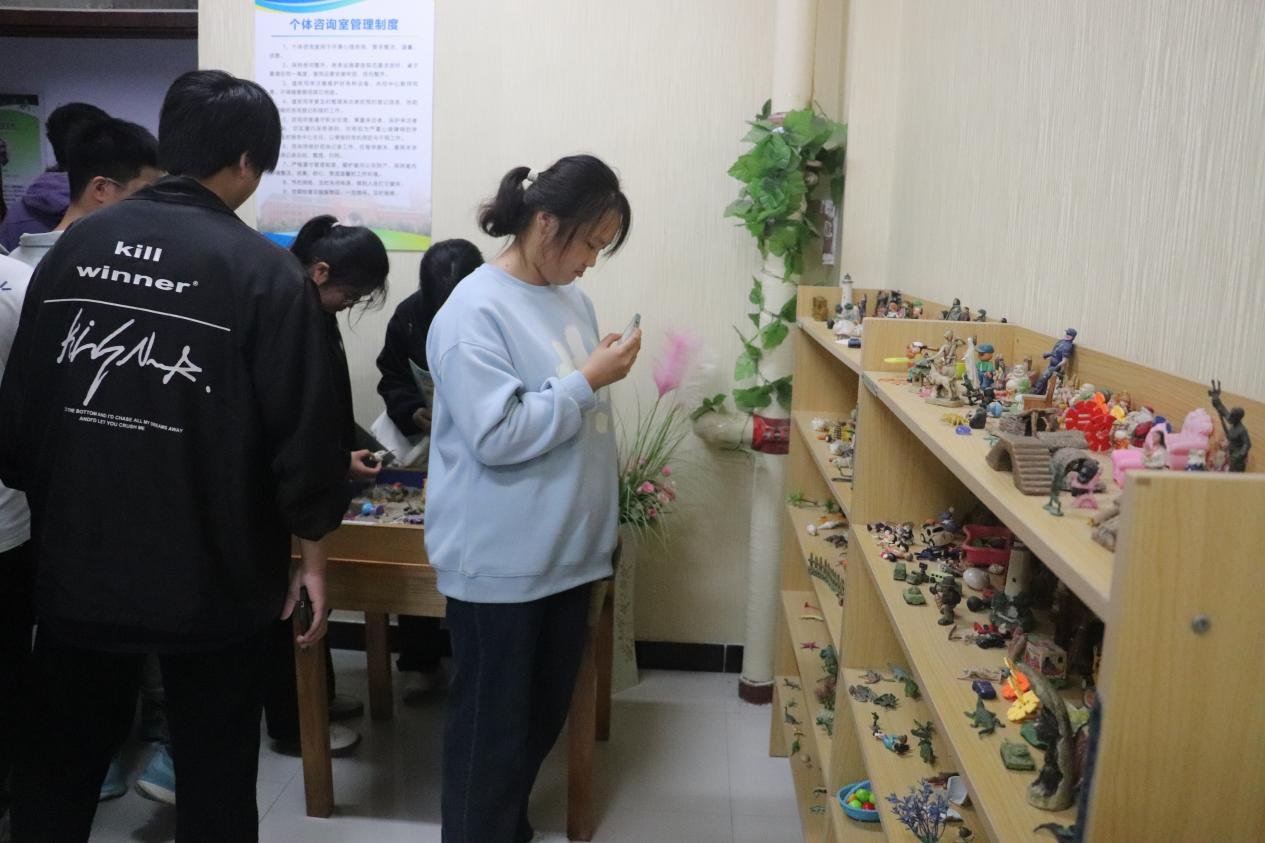 在团委书记李听和中心志愿者带领下,大家对心理中心的发展历程、主要服务项目、咨询地点及方式、预约流程、来访者须知以及各个功能室进行了详细的了解,并参观了预约等候室、个体心理辅导室、音乐放松室、宣泄室、沙盘游戏室、团体心理辅导室、双湖语轩工作室和团体心理活动中心等,参观沿途学生也通过观看展板了解相关心理知识。