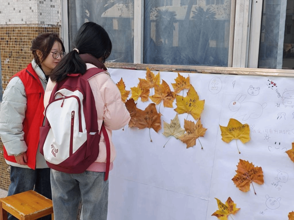 活动期间,学生们抽取志愿公益任务卡片并完成各种任务:在校园内捡拾树叶并在纸片或树叶上写下祝福语并贴到展板上,传递美好情感,让这个冬天不再寒冷;在展板上绘画,捕捉冬日的美丽与宁静,为校园增一抹亮色;在情绪驿站写下自己近期的问题与烦恼,阅读并认真回答他人的疑问,互帮互助进行心与心的交流。此外,还有有趣的知识问答任务,用创新方式传播志愿者文化。
