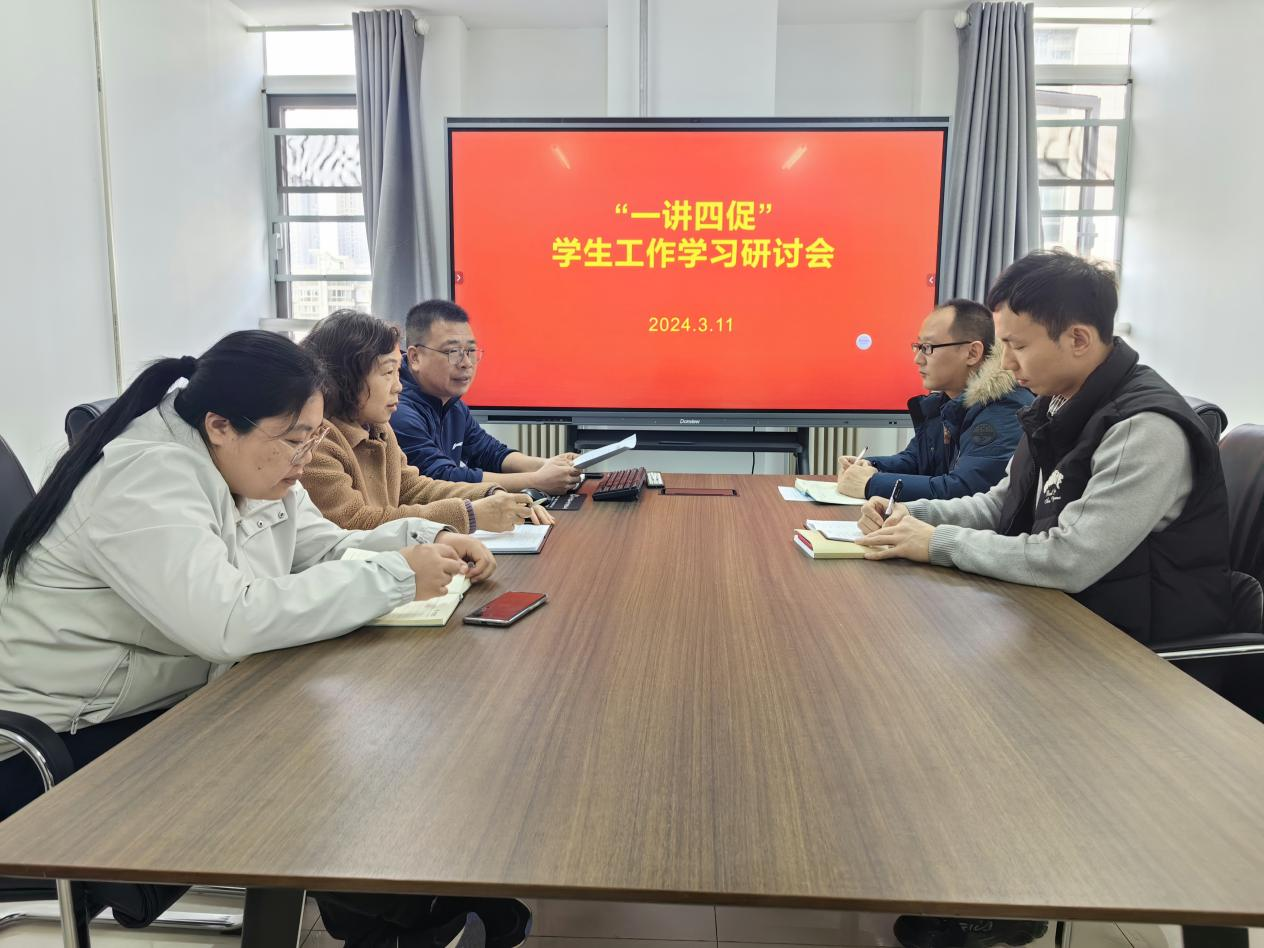 在弘德楼A212会议室举办“一讲四促”学生工作学习研讨会,学院党委书记周启、党委副书记董华明、各年级辅导员参加研讨会。
