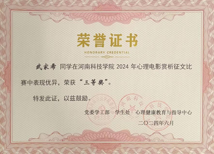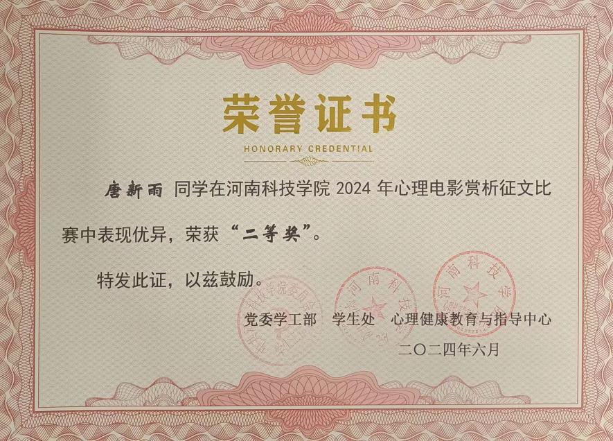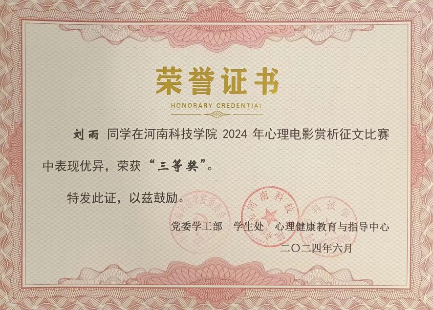 6月18日,由党委学工部、学生处、心理健康教育与指导中心主办,人工智能学院承办的91官网 2024年心理电影赏析征文大赛圆满结束。经初评、复评等环节,91官网 唐新雨获得二等奖,刘雨、武家希和赵怡博等3名同学获得三等奖。