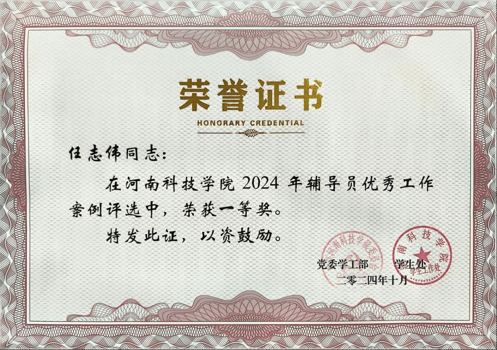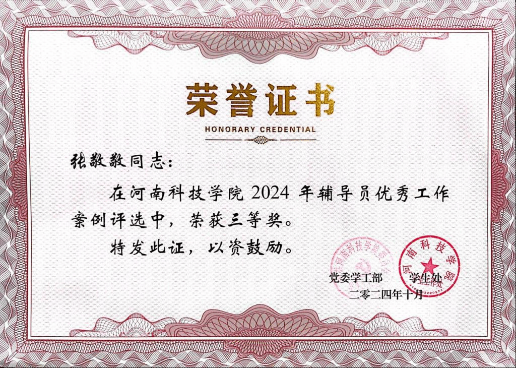 近日,党委学工部学生处公布了2024年辅导员优秀工作案例评选结果辅导员任志伟《走出阴霾,重见阳光——一例由家庭变故和学业压力引发的轻生自杀危机的干预报告》李听《关注学生情感障碍,助力学生重建自我》分别荣获等奖,张敬敬《珍惜生命,远离赌博,理性成就未来》荣获三等奖。