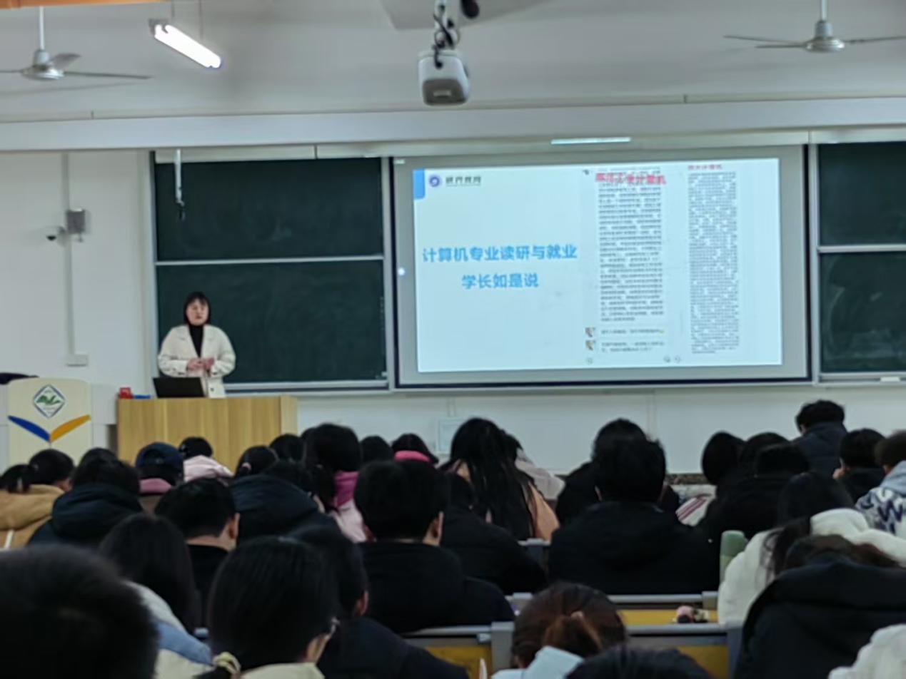 在弘善楼合二举办考研辅导。会议邀请考研指导老师杨笑圆和计算机优秀讲师鲍松山进行专题讲座,2022级考研学生150人参加此次活动。
