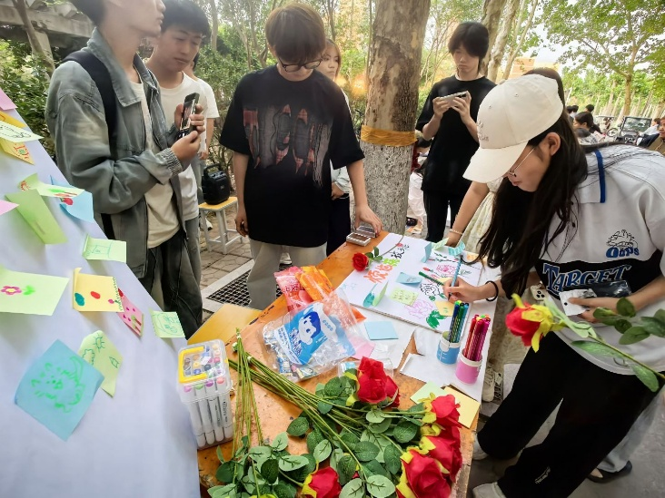 活动现场,学院团委心理部精心准备的彩色便笺纸、印着“把烦恼留在这里,让美好握在手中”标语的展板,与娇艳的玫瑰花束相映成趣。同学们纷纷驻足,将课业负担、人际关系矛盾、自我怀疑等内心的困惑与压力书写成文字。随着活动推进,一张张承载真实情绪的纸条贴满展板,一枝枝玫瑰传递到同学们手中,活动参与热情高涨。