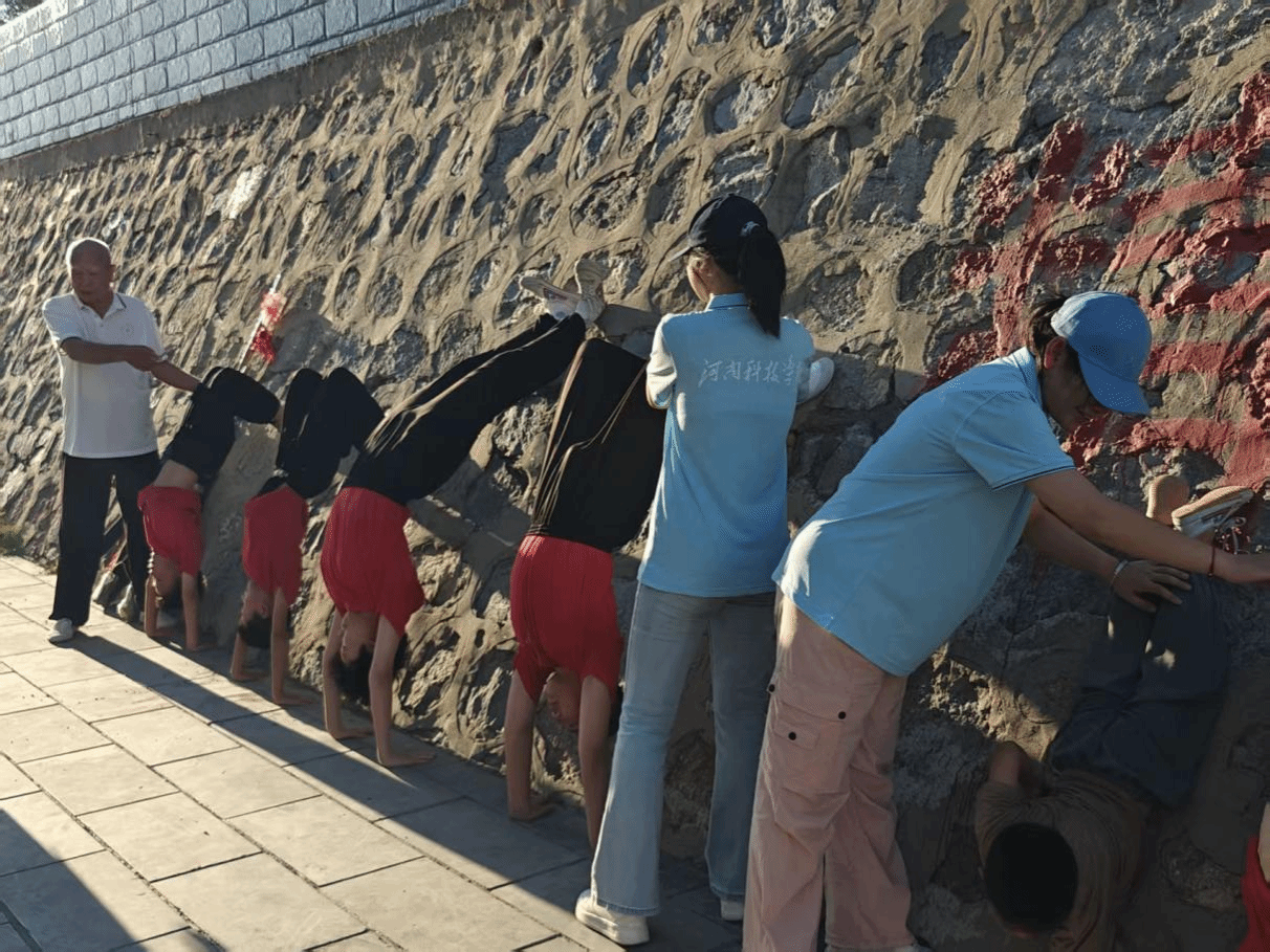 在岳家拳教育基地,队员们化身“武术教练”,讲授抱拳礼,辅助孩子们倒立,纠正拳法,让孩子们在一招一式的打磨中体会武术的乐趣。同时,成员们还向孩子们传授了自卫防身技能和暑期防溺水安全知识。